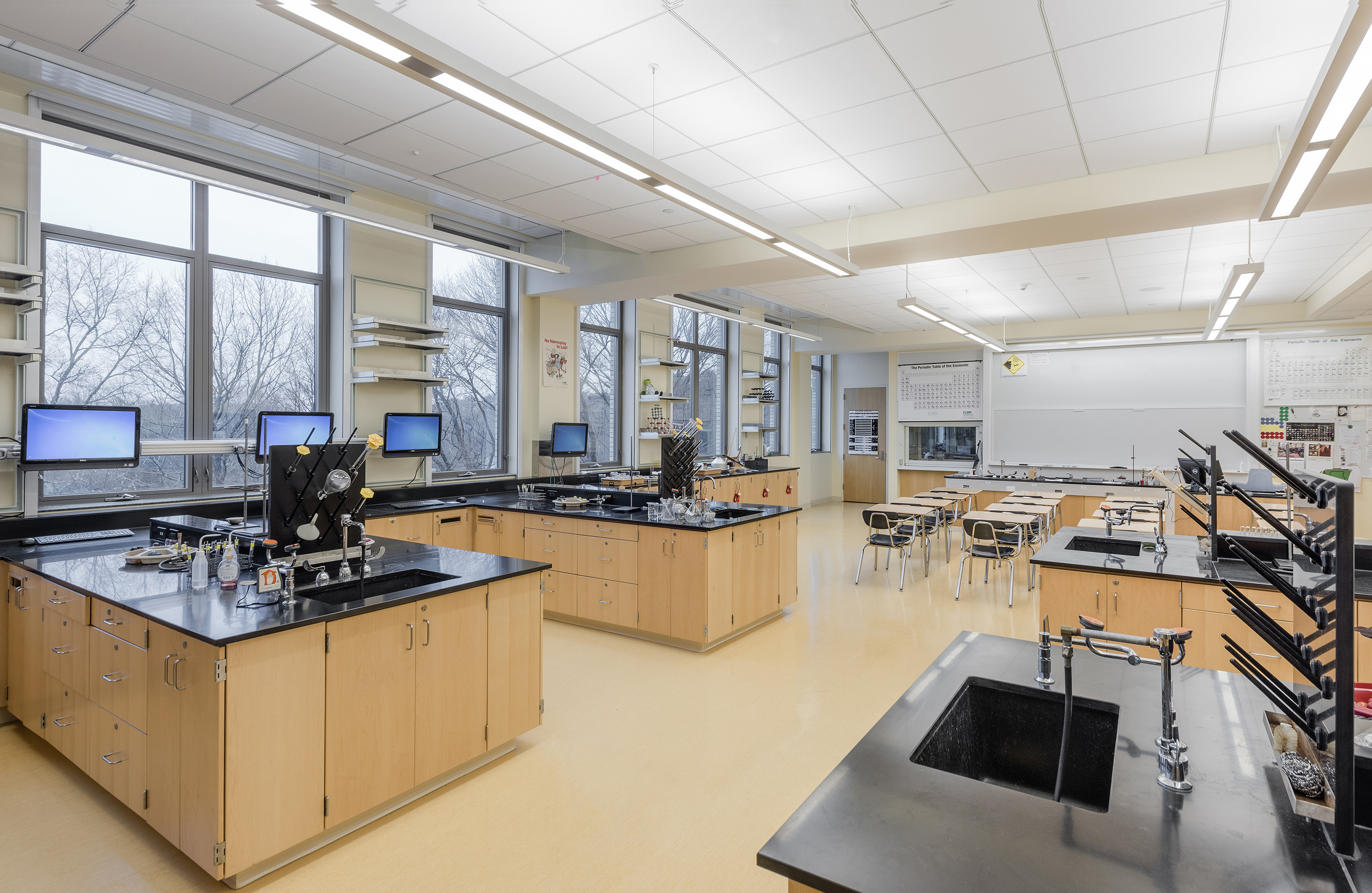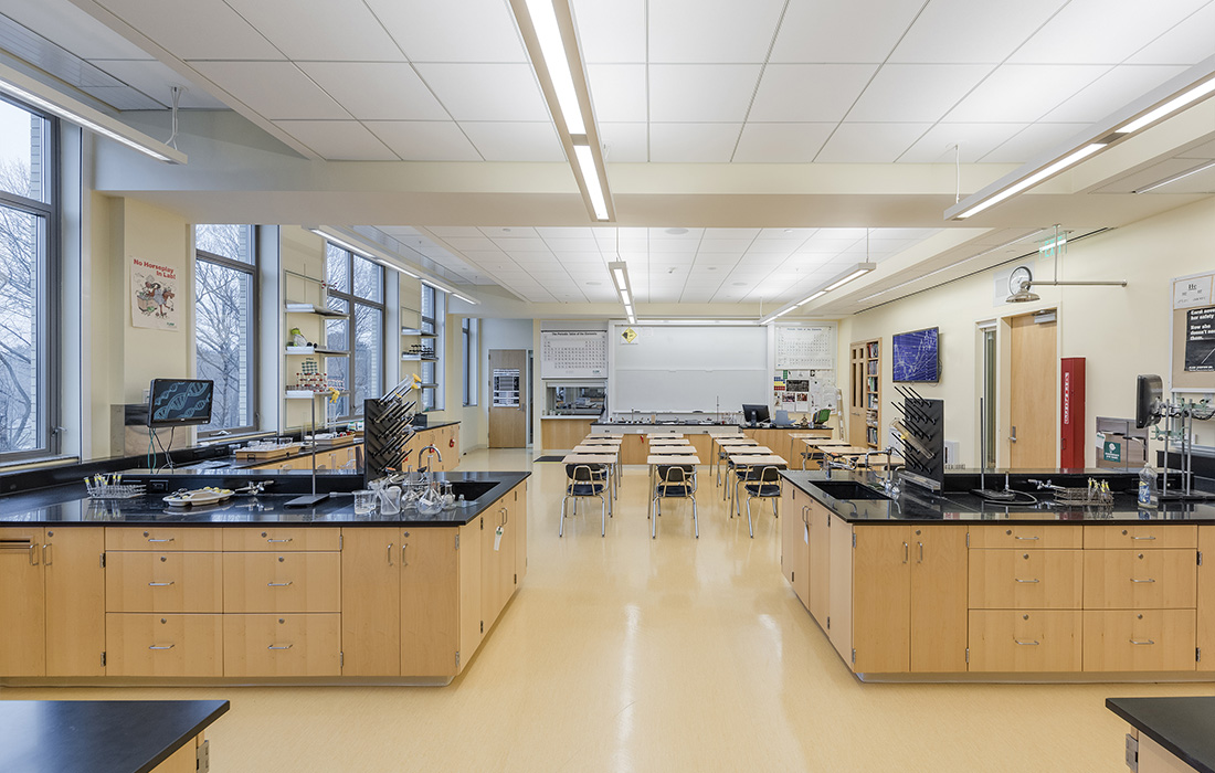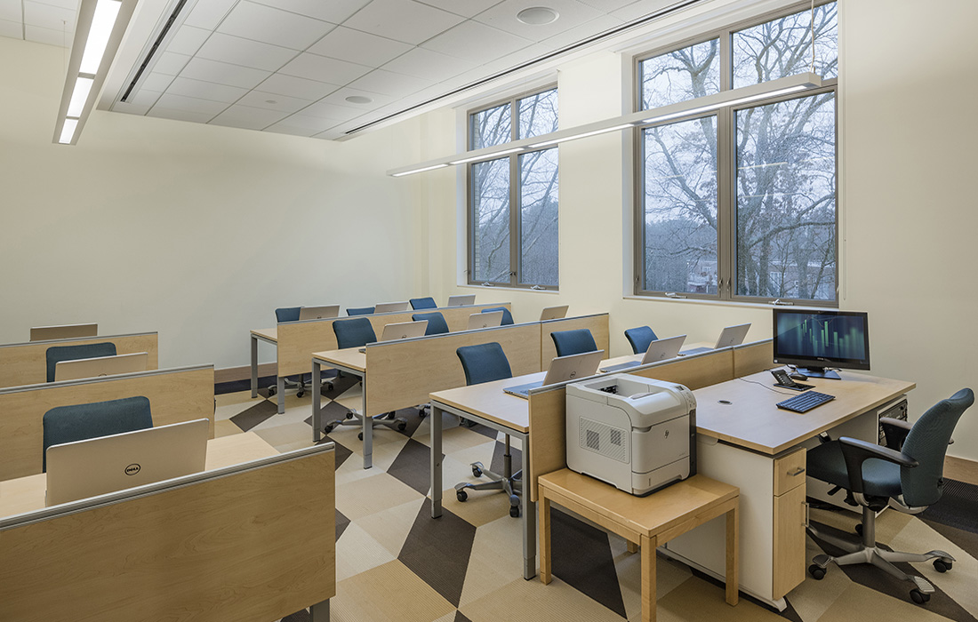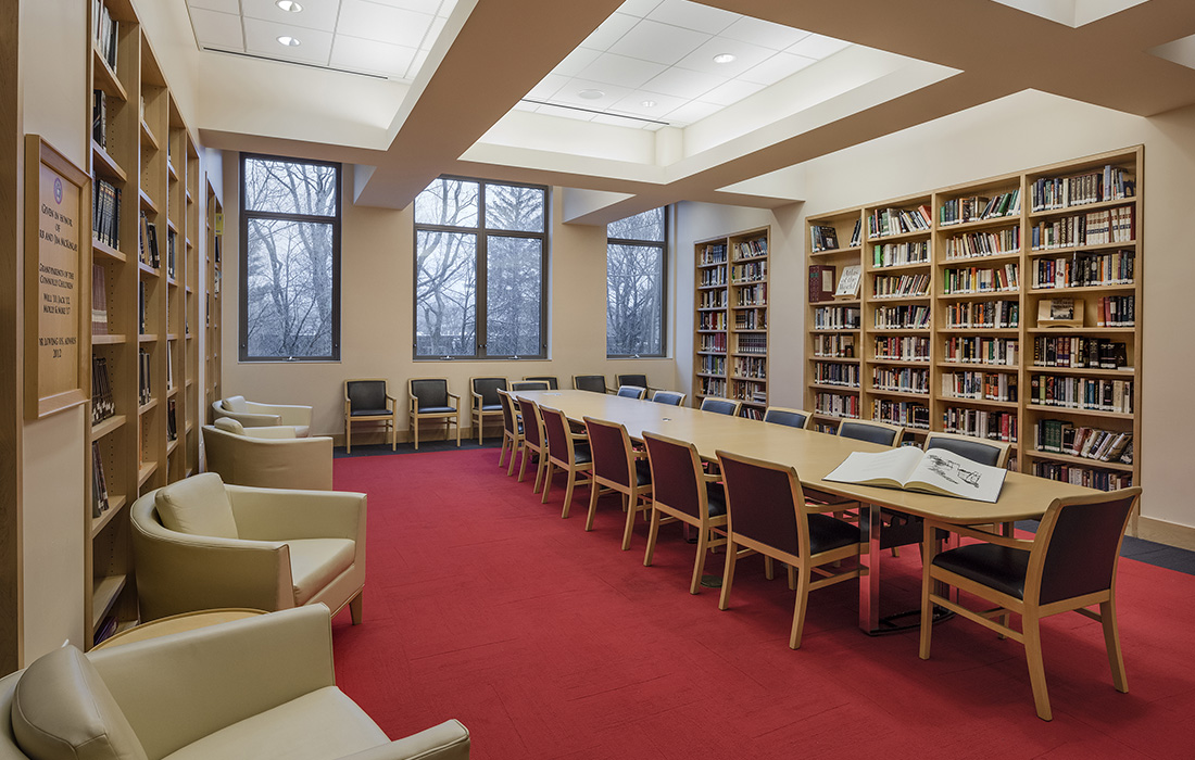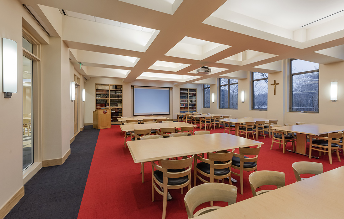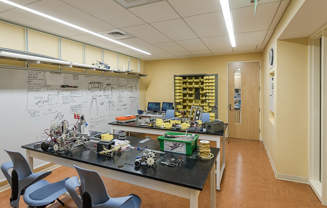 This major expansion of the Academic Building by the addition of the Science, Mathematics & Library Center provides 33,000 SF for the teaching of science and mathematics, independent studio spaces for innovation in engineering, an expansion of the existing library with a Reading Room, a Seminar Room dedicated to the study of science and ethics, a computer lab for mathematics and science, and an open study for collaborative student work. Like the Arts Building which extends the campus plan along the riverfront, the Science, Mathematics and Library Center frames the campus on its east side, encloses it along the route 128 right-of-way, and incorporates St. Bartholomew’s Church in the overall campus plan. In 2019, we developed studio spaces included in the original program for independent work to create a new Innovation Lab.